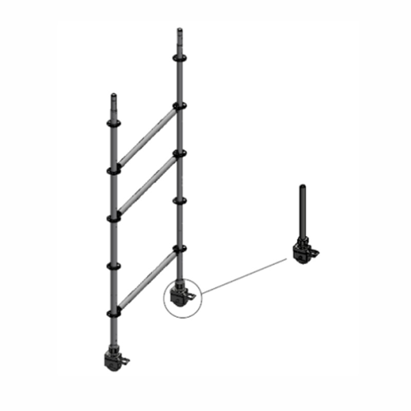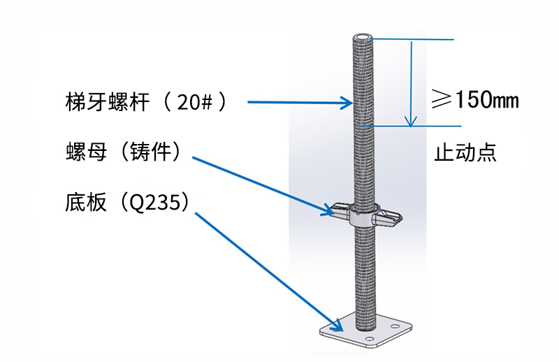 插入立桿底端可調(diào)節(jié)高度的底座。主要用于調(diào)節(jié)架體在不平整的環(huán)境進(jìn)行調(diào)節(jié)。