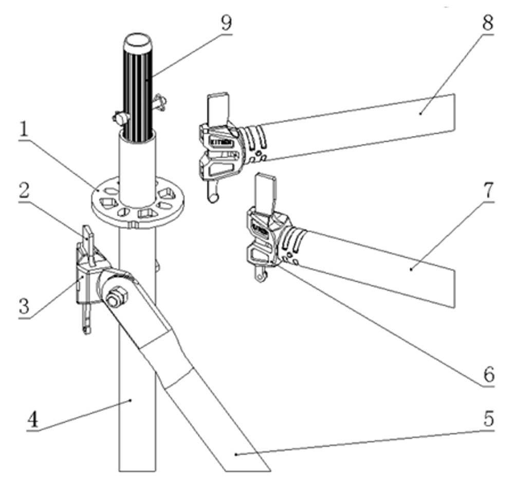② 兩端裝配有轉(zhuǎn)動扣接頭,與立桿連接盤采用插銷連接的斜向桿件。